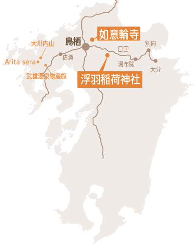 山頂に向かって続く、鮮やかな朱色の千本鳥居。インスタグラムなどで“写真映えする”として人気を集めているスポットです。実際には91基の鳥居が約300段の階段沿いに設けられ、そこを登ると筑後平野を望む絶好のビュースポットに到着します。天気が良ければ原鶴温泉や遠くは甘木方面まで見渡すことも。商売繁盛や長命長寿、学問の神様として信仰される『浮羽稲荷』で新年の抱負を祈願しましょう。。